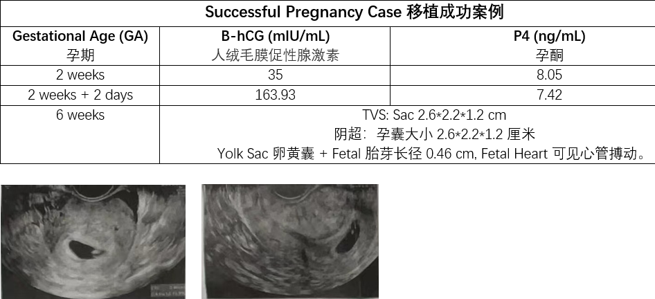 终于,在移植后的第2周,我检测到人绒毛膜促性腺激素为35mIU/mL,孕酮为8.05ng/mL。这个消息让我欣喜若狂,我知道我可能怀孕了。2周+2天,人绒毛膜促性腺激素升高到163.93mIU/mL,孕酮为7.42ng/mL,这进一步证实了我怀孕的事实。到了6周,我去医院进行阴超检查,当看到屏幕上孕囊大小为2.62.21.2cm,卵黄囊可见,胎芽长径0.46cm,并且可见心管搏动时,我激动得无法自已。我终于成功怀孕了,这是我多年来梦寐以求的事情。