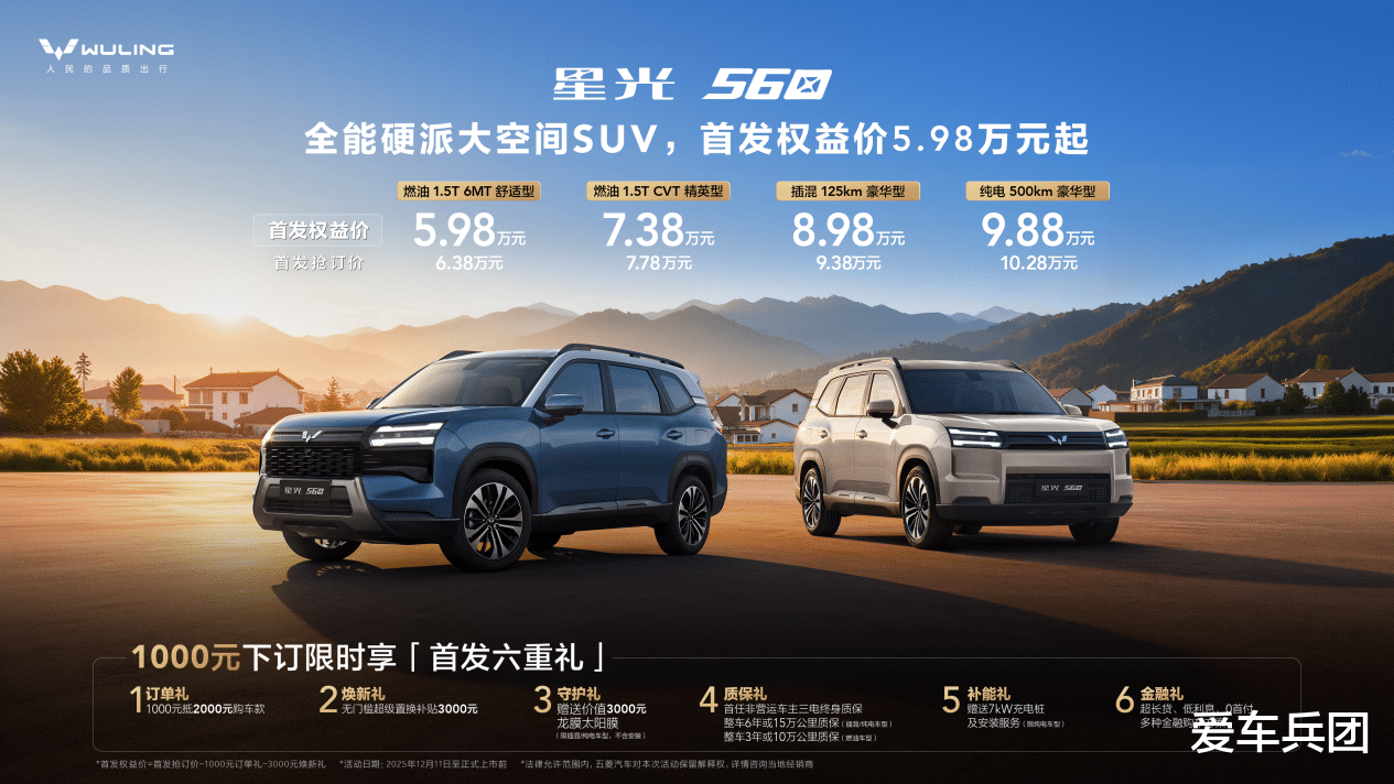 今日,「全能硬派大空间SUV」——星光560正式亮相2025东盟国际车展,并同步全球线下首发。新车共推出四款车型配置:燃油1.5T 6MT舒适型、燃油1.5T CVT精英型、插混125km豪华型及纯电500km豪华型。为回馈用户,五菱带来了更硬的首发权益价,对应四款配置分别为5.98万元、7.38万元、8.98万元和9.88万元,原首发抢订价为6.38-10.28万元。