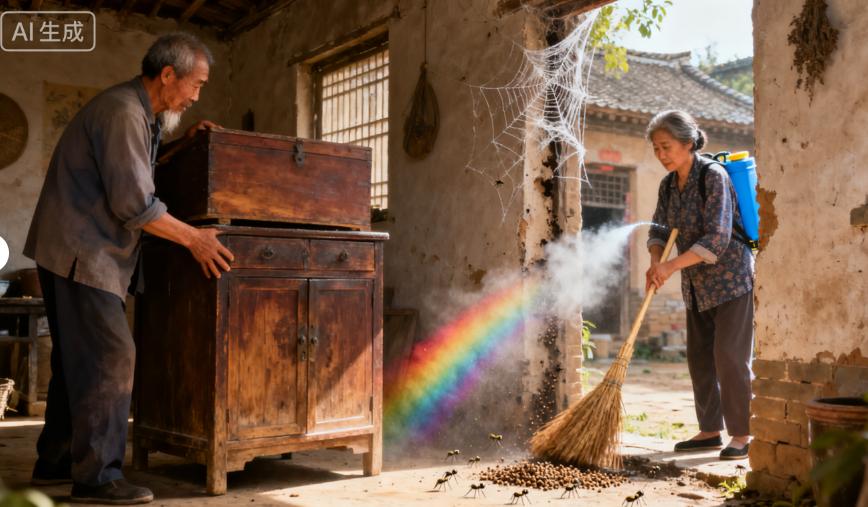 回到家,夫妻俩立刻行动起来。赵老实找来撬棍,把厨房的橱柜挪开,刚挪开,王桂兰就惊呼了一声 —— 橱柜后面的地面上,堆积着厚厚的灰尘,还有不少米粒、菜叶的残渣,几只蚂蚁正趴在上面啃食。赵老实赶紧拿起扫帚,把这些脏东西扫进簸箕里,又用湿布反复擦了好几遍,最后喷上了从医馆买来的消毒水。