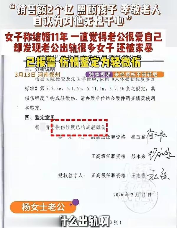 今年1月31号更是关键,两人吵架后,杨女士被老公用锤子砸头,脸被扇,还被推下二楼,她九岁的女儿因害怕报警,医院鉴定的伤情是轻微伤,医生一句话:再差三厘米,就救不到了,家暴的阴影,和外面的风光日子完全是两套脸。