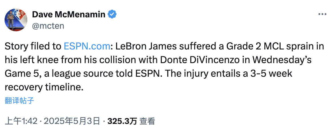 湖人麾下三巨头在这轮系列赛均受伤病困扰,除东契奇突发肠胃炎及腰背受伤以外,詹姆斯与里弗斯也都出现伤病。据湖人随队记者Dave McMenamin报道,詹姆斯在G5与迪温琴佐猛烈相撞痛苦倒地,这次碰撞导致詹姆斯左膝内侧副韧带二级扭伤,他需要3-5周的时间进行恢复,哪怕湖人能拿下G5,詹姆斯也将因伤无缘出战G6,他连续出战292场季后赛的纪录将会就此作古。