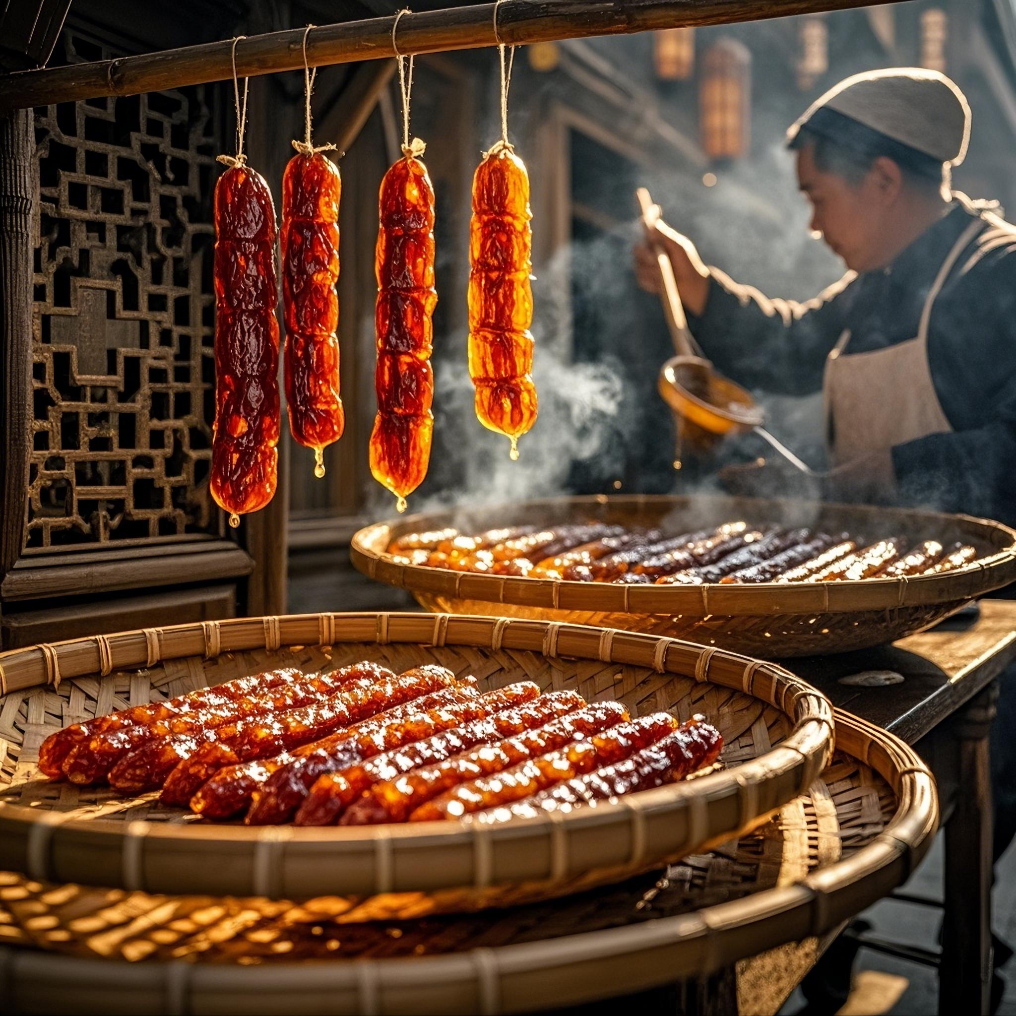 ② 舌尖上的非遗腊味"北方的熏肉南方的晒",源自清代"海上丝绸之路"的晾晒智慧,选用漠阳江畔放养的黑猪,用荔枝木慢熏128小时。肥瘦相间的腊肠在阳光下泛着琥珀光泽,蒸煮后油脂析出,瘦肉纤维如丝绢。