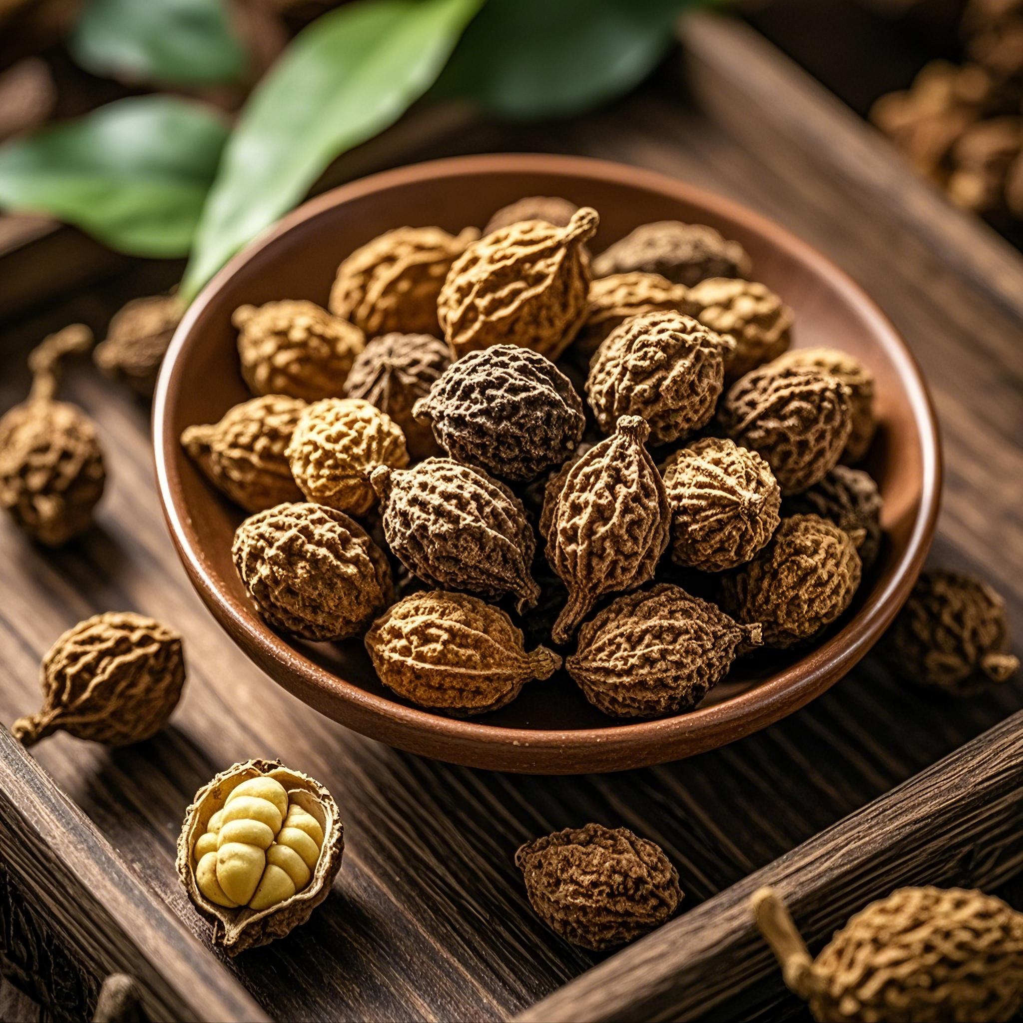 ② 阳东益智"南药王国的小卫士",野生于喀斯特地貌的益智果,果皮薄如蝉翼,晒干后皱缩成龙眼状。含桉油精等36种活性成分,泡水可缓解咽喉不适。已开发成养生茶包。