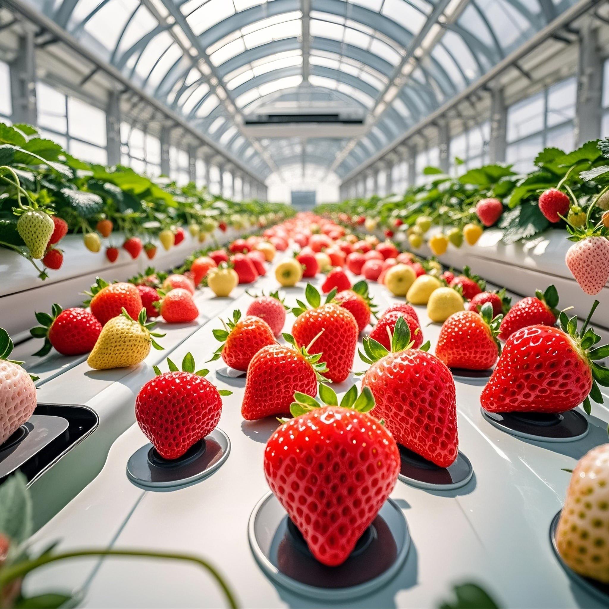 ① 智能温室草莓"无土栽培的七彩宝石",采用水肥一体化技术,全年结果,糖度达12°。果皮薄如蝉翼,自带天然奶油香。每颗草莓可追溯200项生长数据。