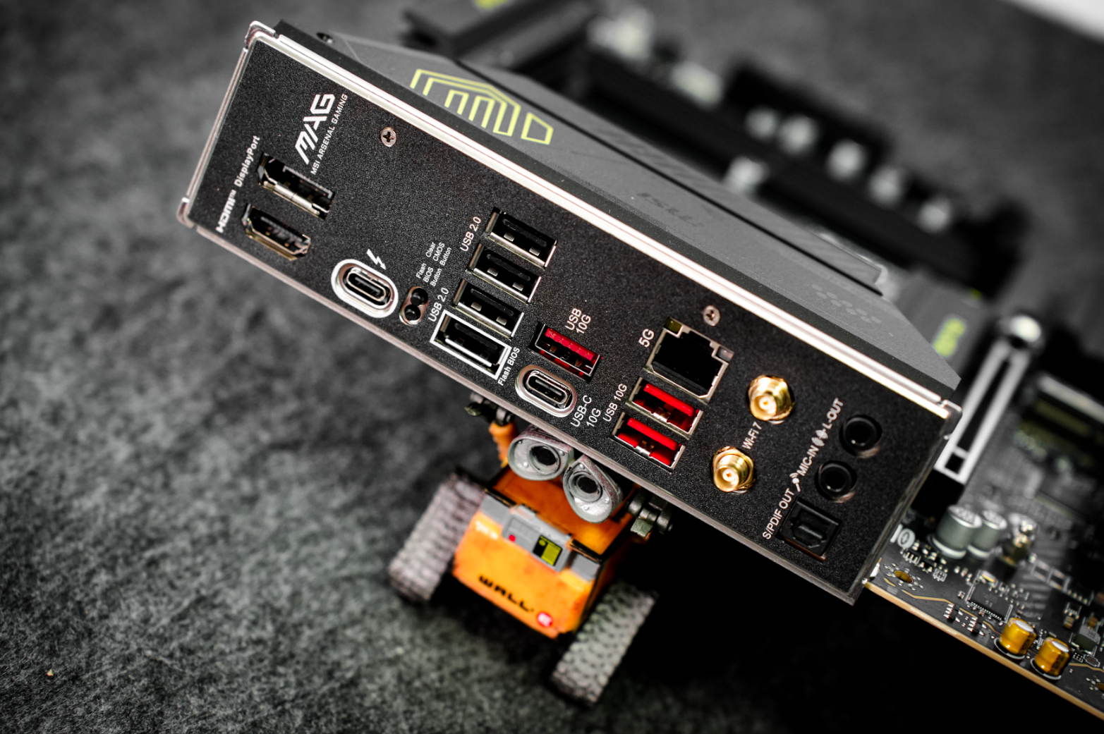 还有背部的I/O区域也是极为丰富,不但搭载了HDMI+DP双视频输出接口,还标配了4个USB 2.0接口、3个USB 3.2接口(10Gbps)以及一个Type-C接口(10Gbps),最关键的还有配备了一个雷电4接口(40Gbps+DP输出),再加上5Gbps的有线网络和WiFi 7无线网络,用户体验也是直接拉满。