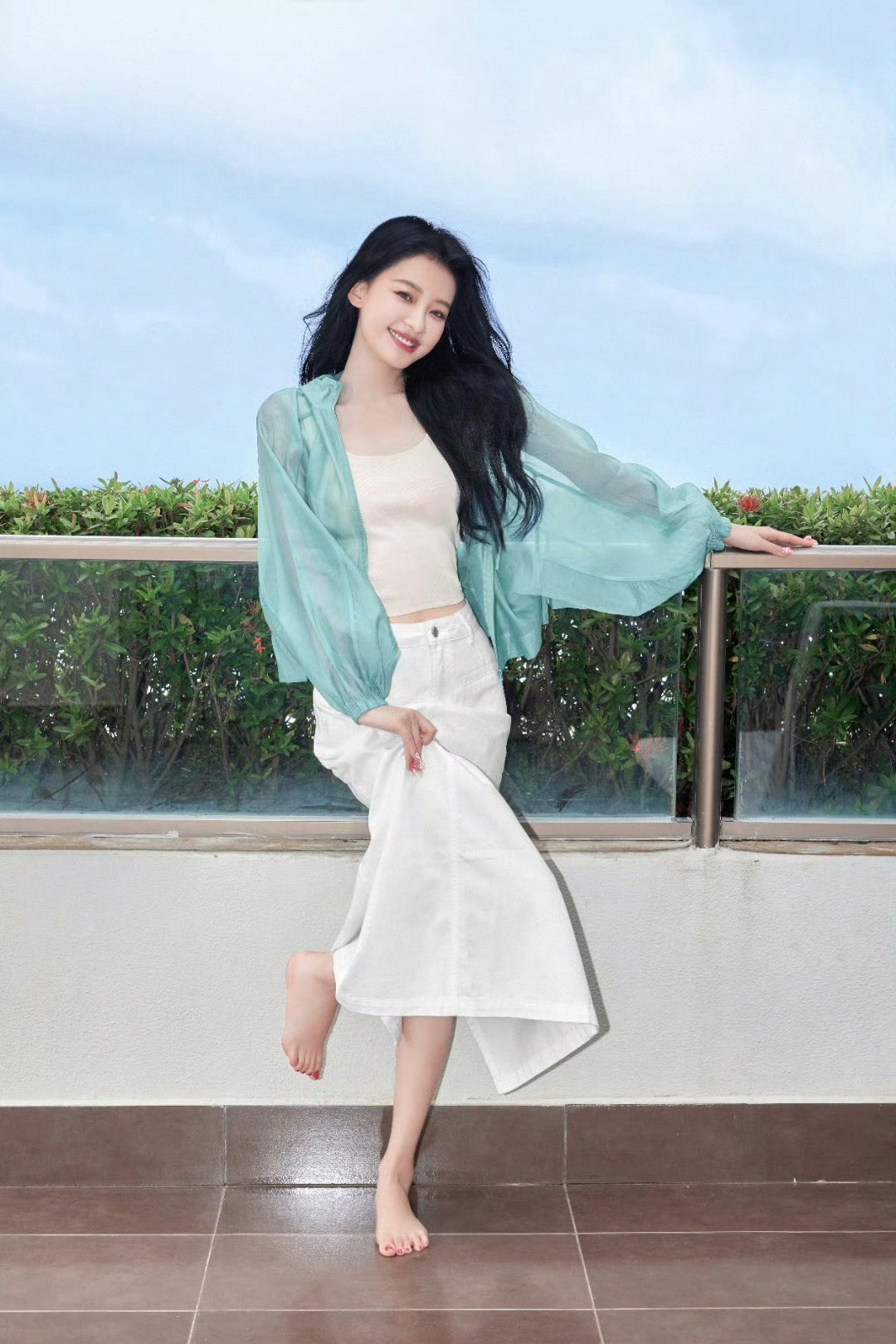 黑色亮片短裙套装,借短款设计直接展现修长双腿,亮片元素又为造型增添时尚感,让大长腿成为视觉焦点;就连清新风的白色长裙配薄荷绿开衫,也因她优越的身材比例,显得整体造型既清爽又兼具修长感。