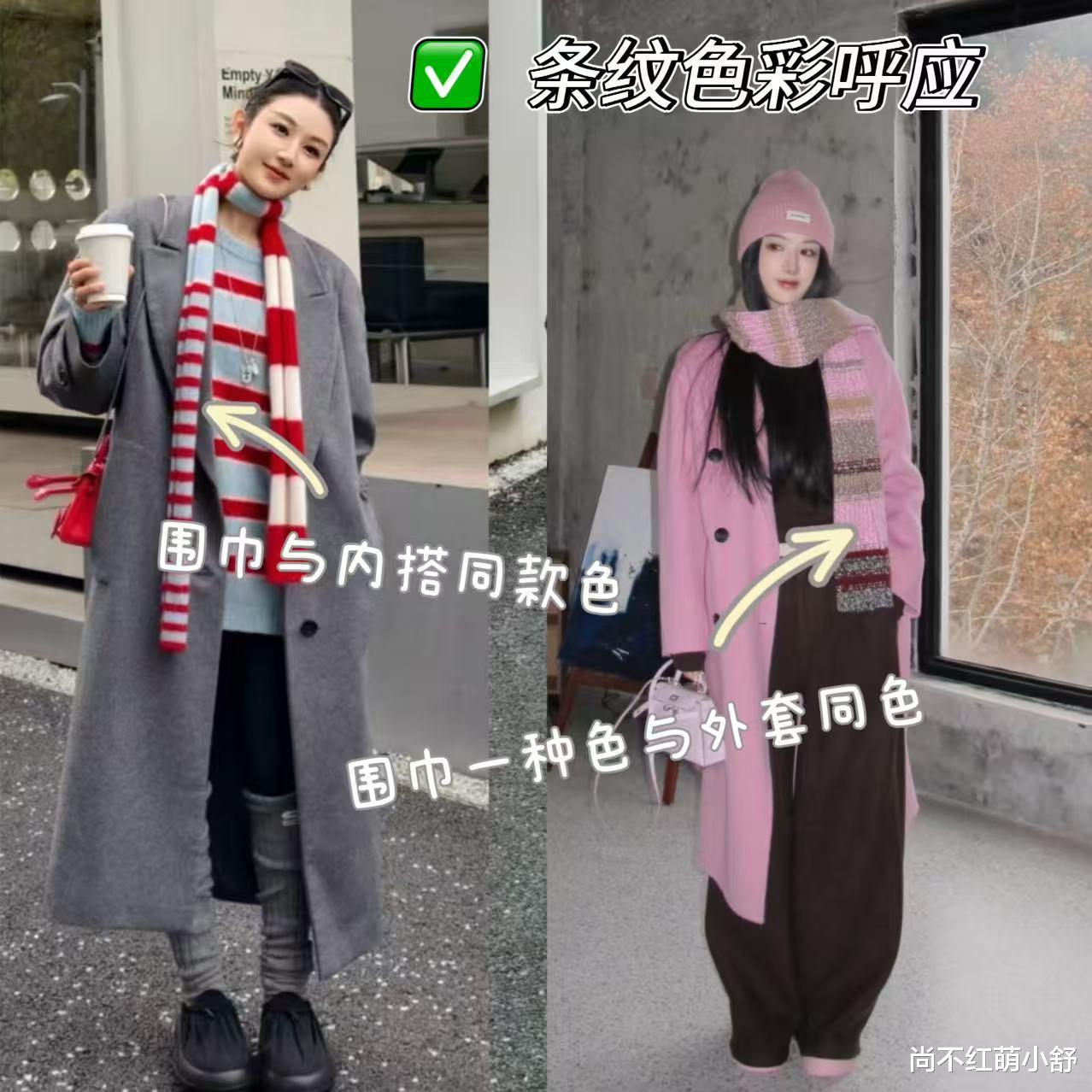 用深色围巾平衡亮色外套或者用亮色围巾点缀深色服装,瞬间提升整体造型的活力。比如薇娅左边这套用灰色围巾平衡亮蓝大衣的跳脱,同色系深浅过渡让整体层次分明;右边以正红围巾点亮灰粉组合,高饱和度色块碰撞出鲜活活力,既保留冬日穿搭的温暖质感,又通过色彩对比或呼应,让造型更吸睛。