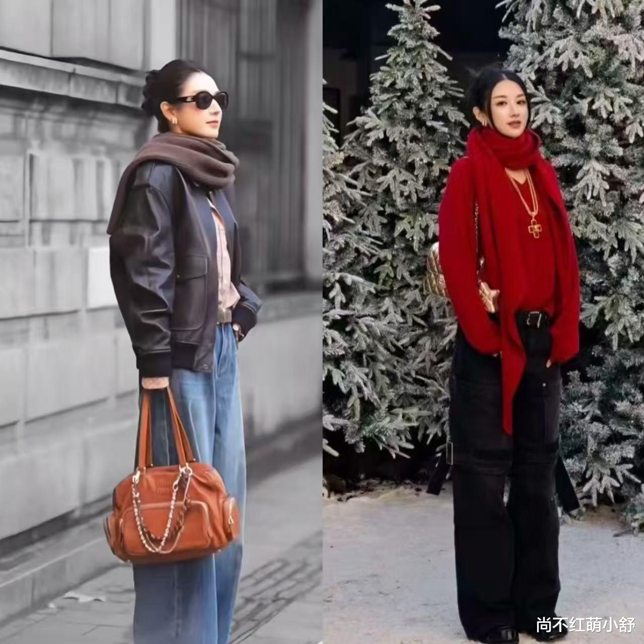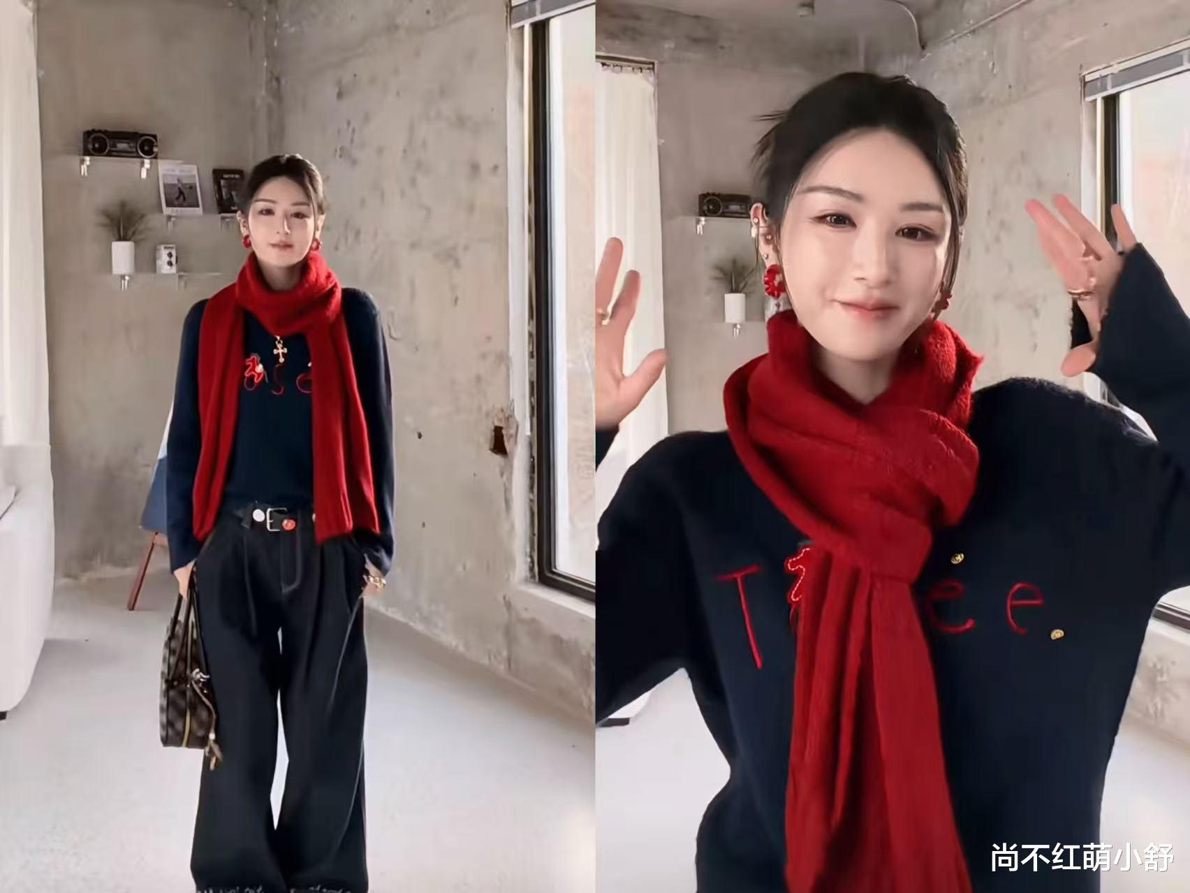 她这款Y字型围巾系法,将围巾绕颈后,把一端斜搭胸前,另一端自然垂落侧边,营造不对称松弛感。不得不说,红围巾配深色毛衣,慵懒随性又显利落,是新年氛围感穿搭的实用技巧。