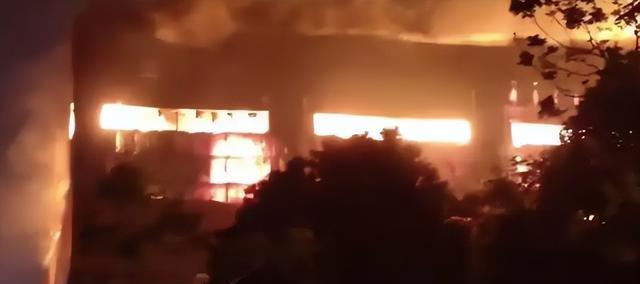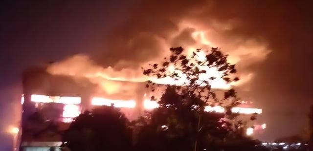 火光在黑夜中显得格外醒目,而从现场传回的视频和照片显示,物流园区内货品燃烧猛烈,火势迅速蔓延至整个园区,火海吞噬了一箱箱货物。