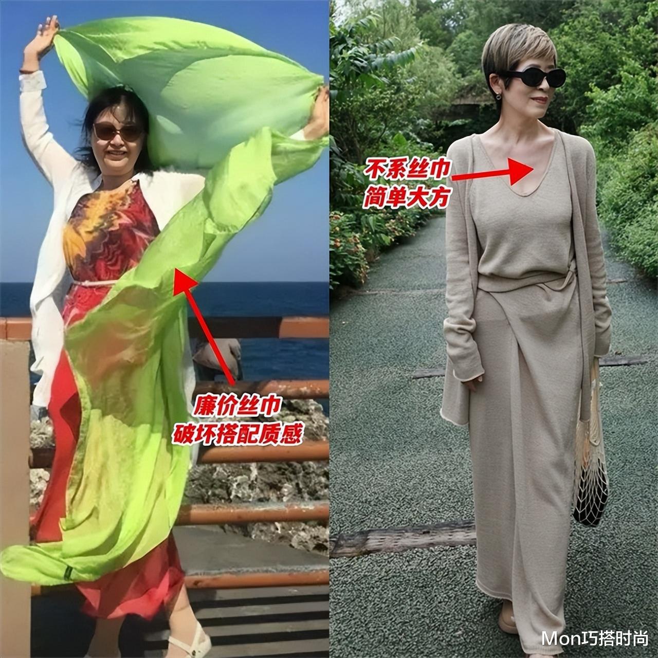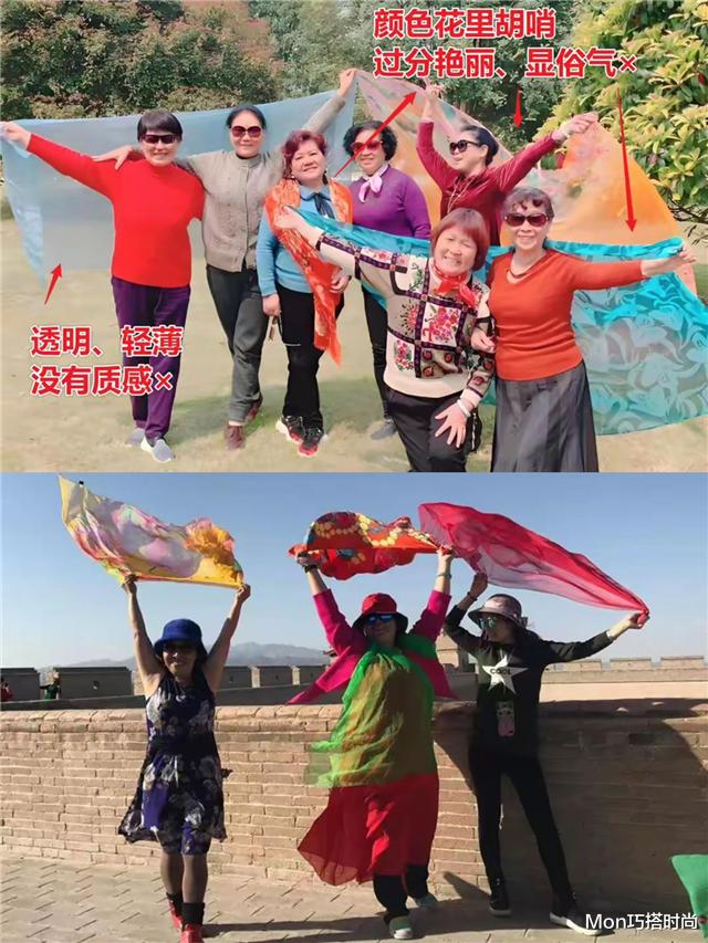 避雷款式①:花里胡哨的丝巾先来说说丝巾,这可是中国式大妈们的心头好,在公园、在广场、在每一个能拍照留念的地方,都能瞧见大妈们身披丝巾的身影。本应是优雅代名词的丝巾,怎么就和廉价感挂上钩了呢?问题就出在这佩戴方式和款式选择上。