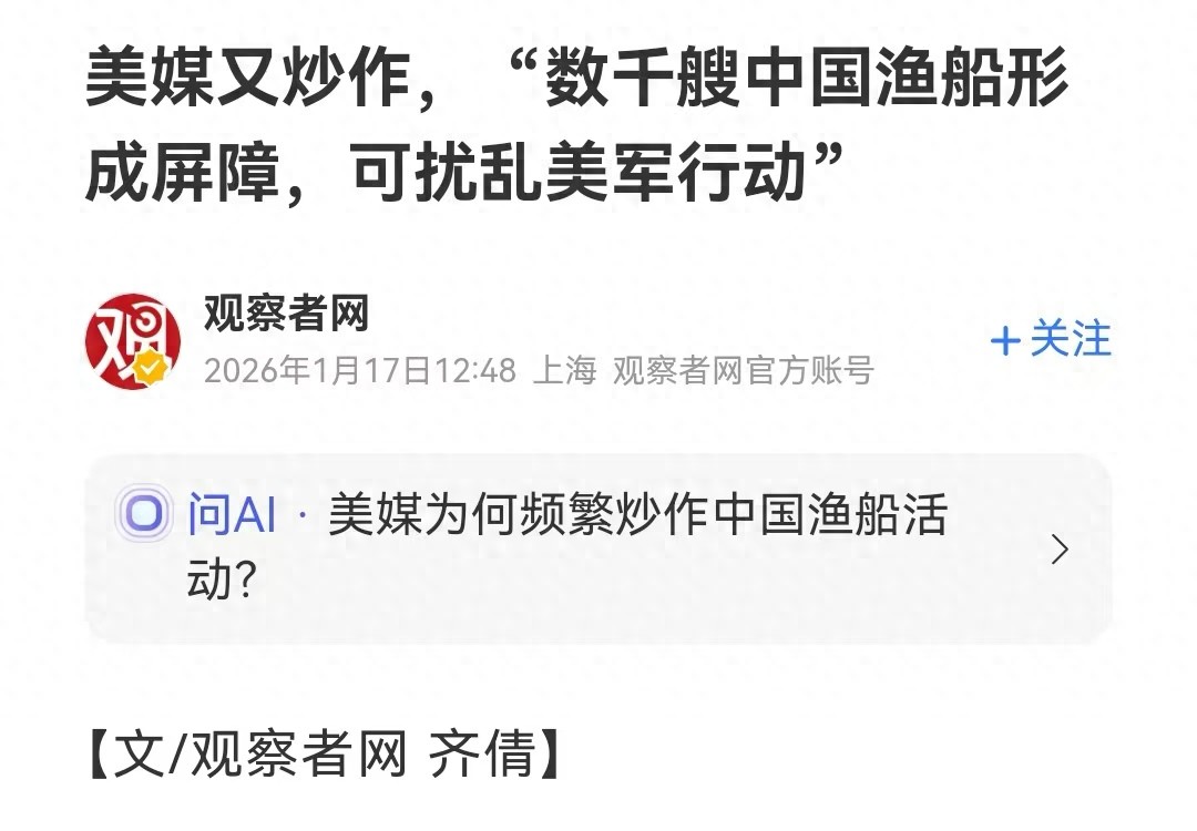 参考资料:《观察者网:美媒又炒作,“数千艘中国渔船形成屏障,可扰乱美军行动”(2026-01-17)》