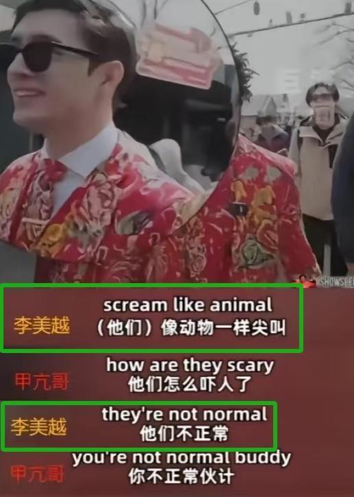 更令人感到震惊的是李美越仿佛一个“拉皮条”,在车上疯狂的甲亢哥表示“需不需要给他介绍中国美女?”