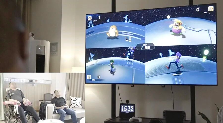 下图:脑虎科技创始人陶虎(右)与患者游戏对战(图源:机器人大讲堂)