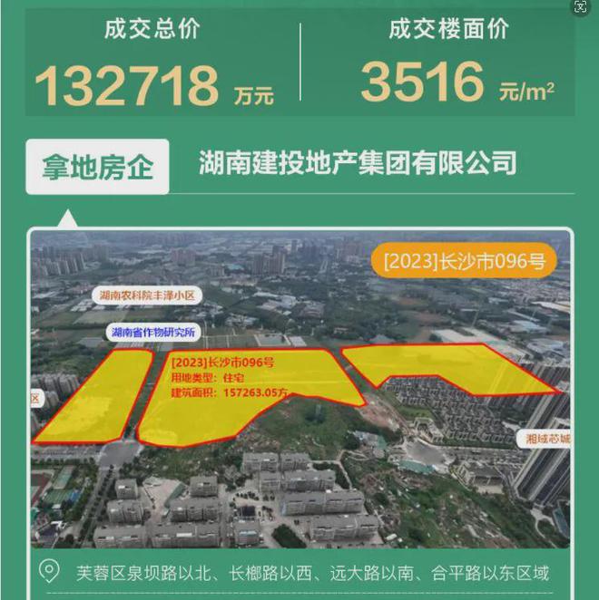今年,还有两宗地块入市,96号地,则位于芙蓉区东湖街道合平村,由湖南建投地产集团有限公司,132718万底价拍下,楼面价3516元/平。
