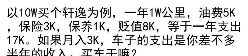 而且,即使我们买了车,也并不意味着我们就要为它而牺牲自己的生活质量。我们可以选择更加经济、合理的养车方式,比如选择性价比高的加油站、合理规划行车路线以节省油耗等等。同时,我们也要学会平衡车和其他方面的开支,不能因为养车而影响到了自己的正常生活。