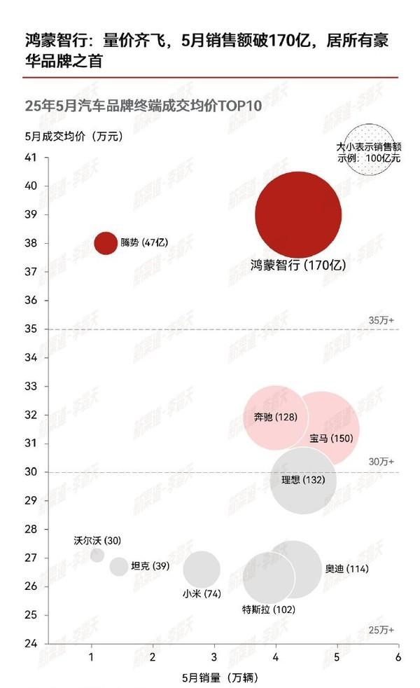 再看整体销售额,超过百亿元的是:鸿蒙智行(170亿元)、宝马(150亿元)、理想(132亿元)、奔驰(128亿元)、奥迪(114亿元)、特斯拉(102亿元)。