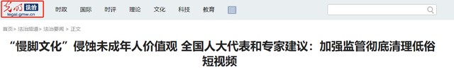 光明网《“慢脚文化”侵蚀未成年人价值观 全国人大代表和专家建议:加强监管彻底清理低俗短视频》