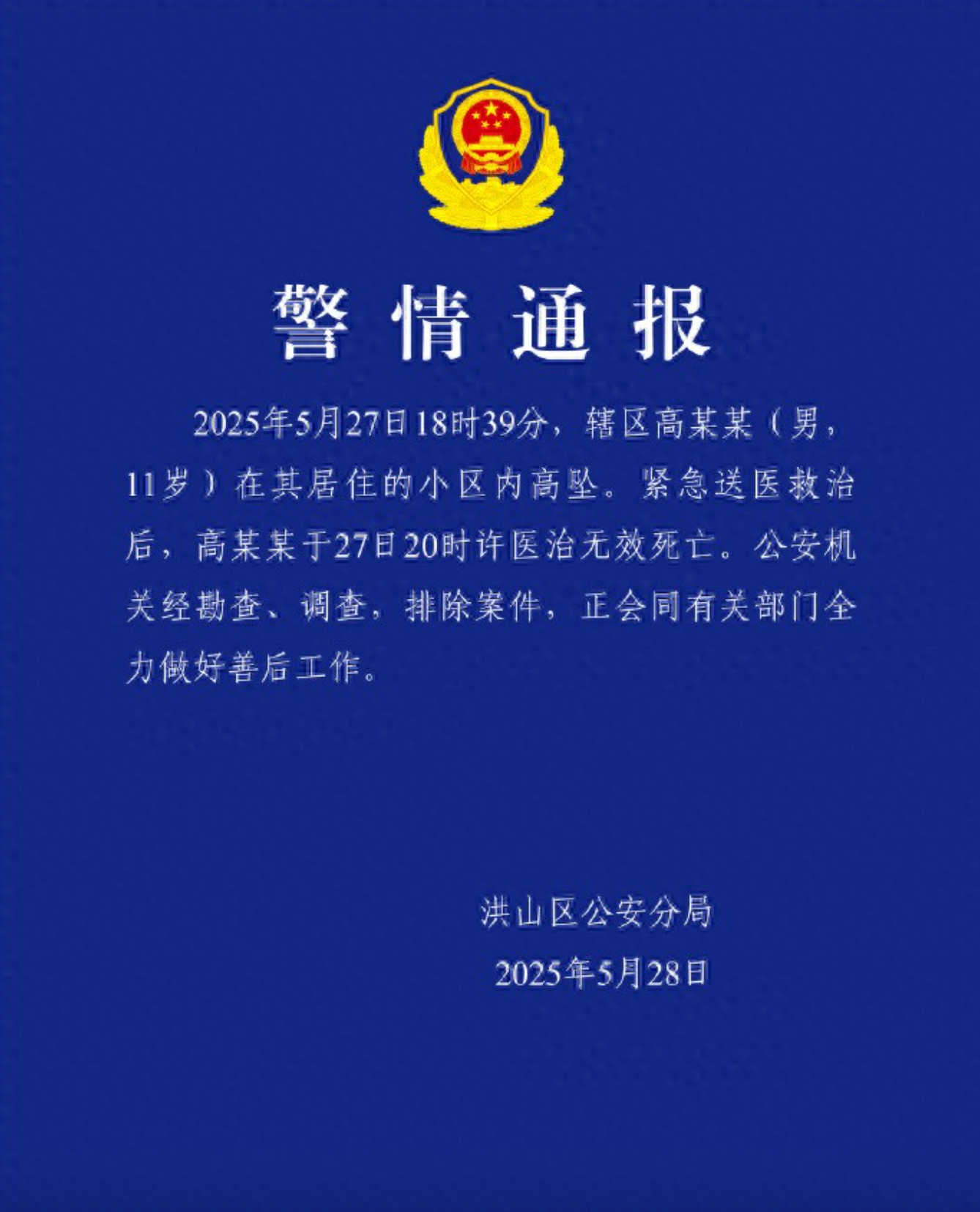 在武汉,一件令人痛心疾首的悲剧发生了。2025 年 5 月 27 日 18 时 39 分,11 岁男孩高某某在其居住的小区内不幸从高处坠落。孩子随即被紧急送往医院抢救,无奈于当日 20 时许,医治无效离世。警方经详尽勘查与调查后,排除案件因素,认定此为一起意外事件。