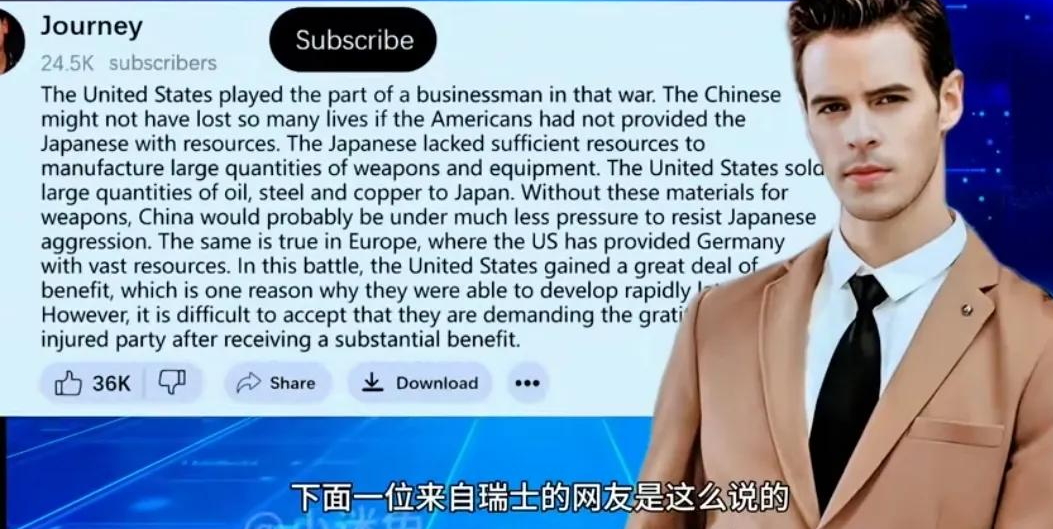 一位瑞士的网友说:“第二次世界大战的前期,美国向很多国家出售武器和资源,也包括日本,日本购买了美国的各种资源,所以才有强大的军事实力,才导致中国伤亡惨重。美国依靠战争大发横财,也迅速成为一个强大的国家,现在却要求中国感谢它,真的让人难以接受。”