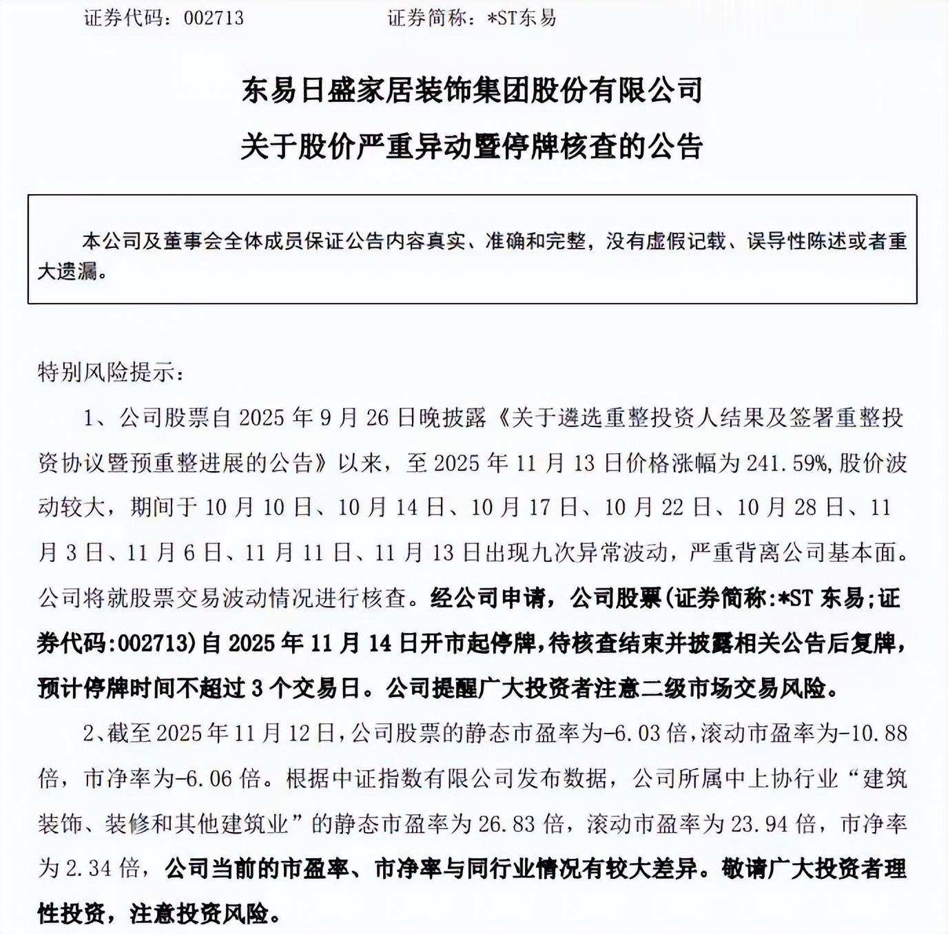 3.界面新闻:《“家装第一股”东易日盛明起停牌核查,重整方案发布以来股价大涨241.59%》