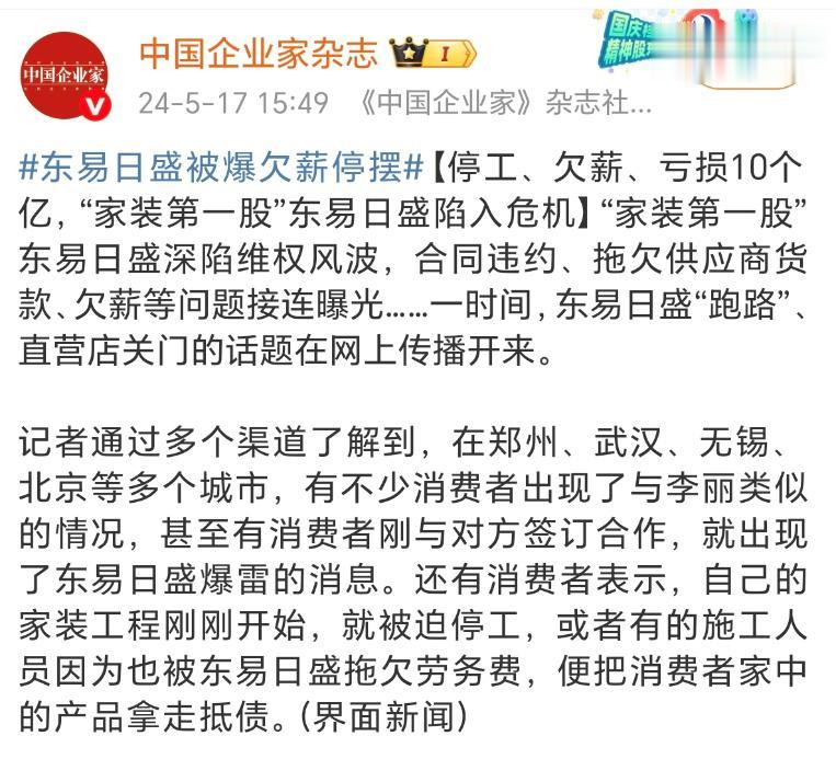不仅如此,东易日盛的员工和供应商也在维权,员工工资拖欠很长时间没发,供应商的货款总计8000多万没有付,有好几家供应商硬生生被拖到倒闭。