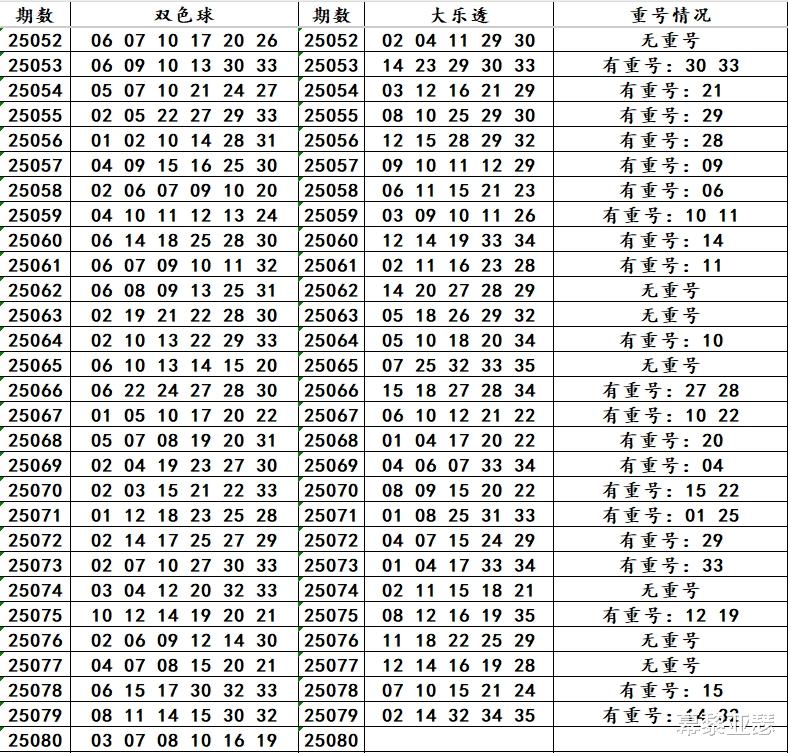 附大乐透和双色球重号走势数据: