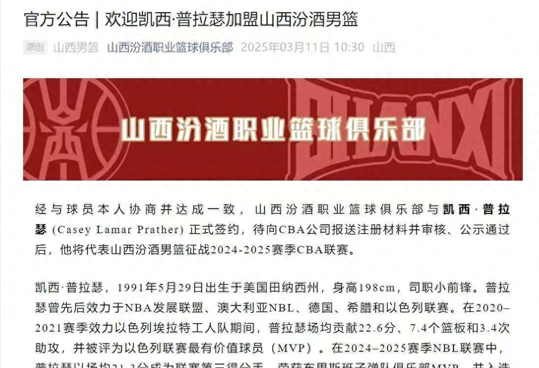 他们官宣了本赛季的第九位外援——34岁的小前锋凯西·普拉瑟,他将身披22号球衣,顶替此前的大外援奥梅纳卡。