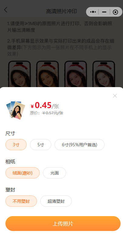 第一次使用时,我就被它的便捷性惊艳到了。无需下载安装,点开小程序就能直接操作。它支持从手机本地相册、微信聊天记录甚至各大网盘直接上传照片,真正做到了“一键冲印”。