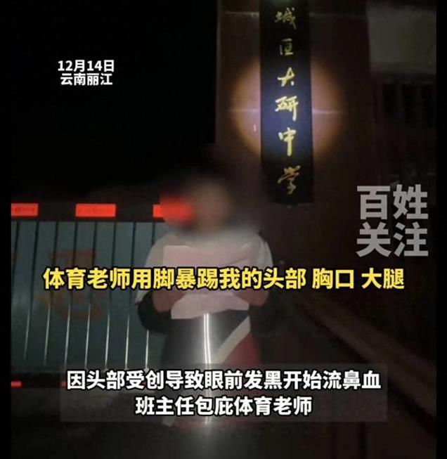 2024年12月14日,云南丽江古城区,一名中学学生在社交平台上,实名举报自己的体育老师,无故踢打自己,目前丽江古城教育局已回应:确实存在打骂情况,已暂停教学!