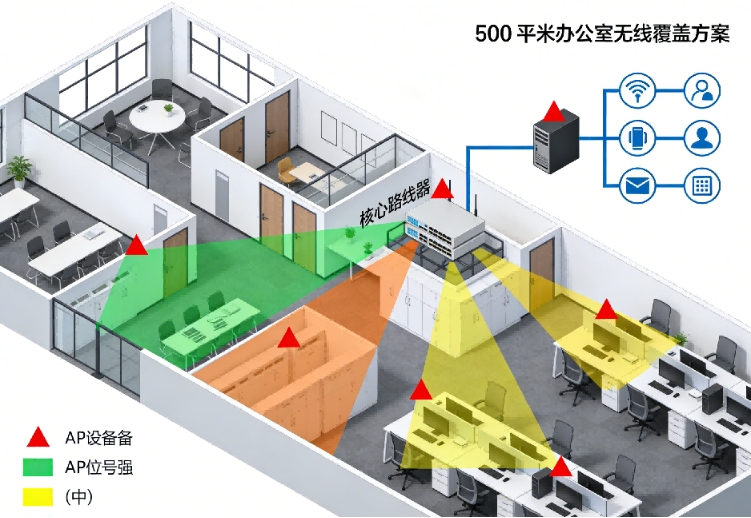 500 平按5-6 台企业级 AP算(吸顶款优先,覆盖范围比壁挂款大 30%),间距控制在 8-10 米;1 台 AP 能覆盖 80-100 平开放区域,有隔断的话覆盖面积减半。