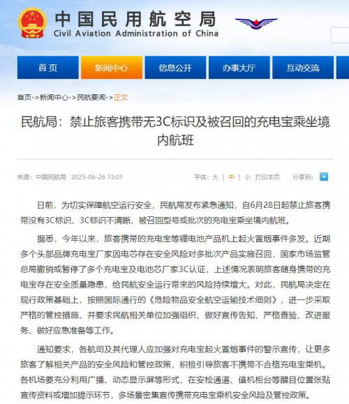 民航总局规定:乘坐飞机时,随身携带充电宝必须标明容量,并通过3C认证,超出容量或无标识产品禁止携带。
