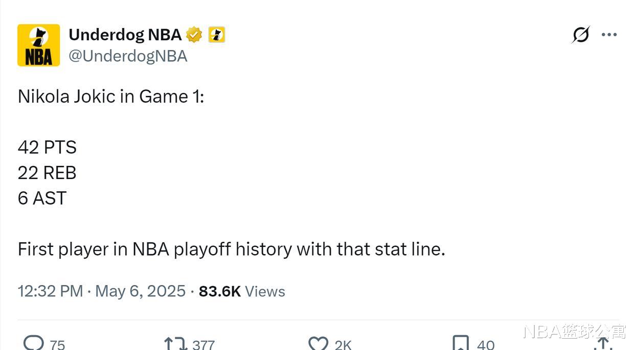 约基奇实现了全方位暴走,他在末节连续砍分,帮助掘金抹平了14分的分差。此外,约基奇还创下了NBA历史第1的神迹。数据显示,约基奇是NBA历史上首位在季后赛单场得到42分22篮板6助攻的球员。