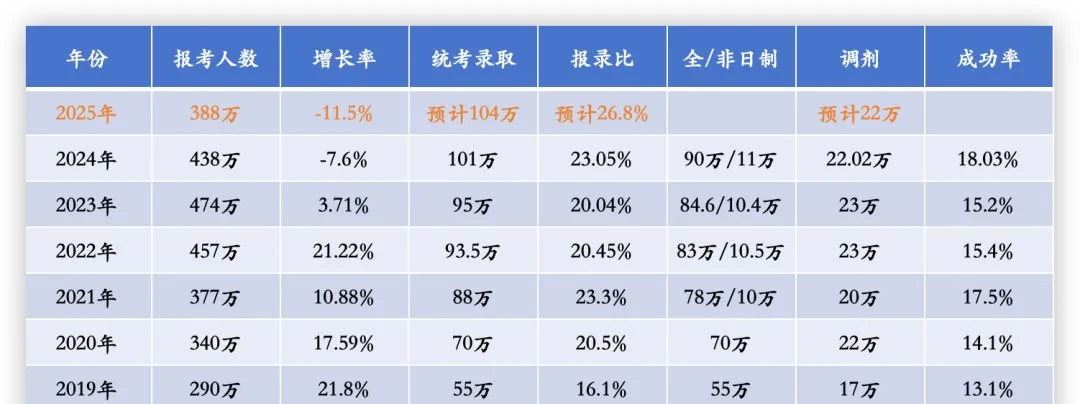 2025年调剂意向采集系统将于3月28日开通,调剂服务系统4月8日启动,较往年更早,以便为后续调剂、复试预留充足时间,避免与高校毕业季、就业高峰期冲突。初试没考好的同学,建议抓住调剂——最后上岸的机会,先给大家看几组数据,让大家对调剂有个直观认识:1)每年过国家线人数大概在30%~40%左右,今年约有 116 万~155 万。2)每年通过调剂上岸的大概有22万左右,占到录取总人数 1/5。而参加调剂人数约在 60~80 万之间,几乎每两个过国家线的同学都有一个会参与调剂。
