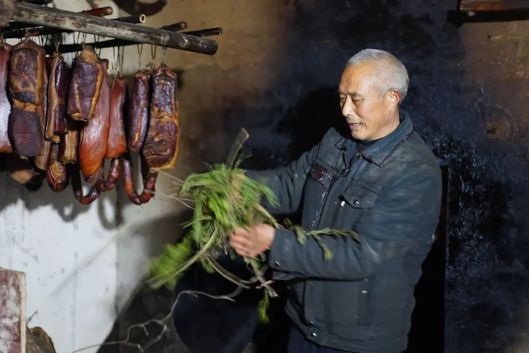 把肉挂好后,先用粗壮的柏树杆熏烤2天2夜,再换成细碎的小柏树枝继续熏烤2天2夜,一共4天4夜,才可以打开炉子,里边的腊肉香肠才算正式完工,熏烤好的腊肉的香肠肥瘦均匀,色泽暗红油润,摸上去表面不浮油,比较干爽。