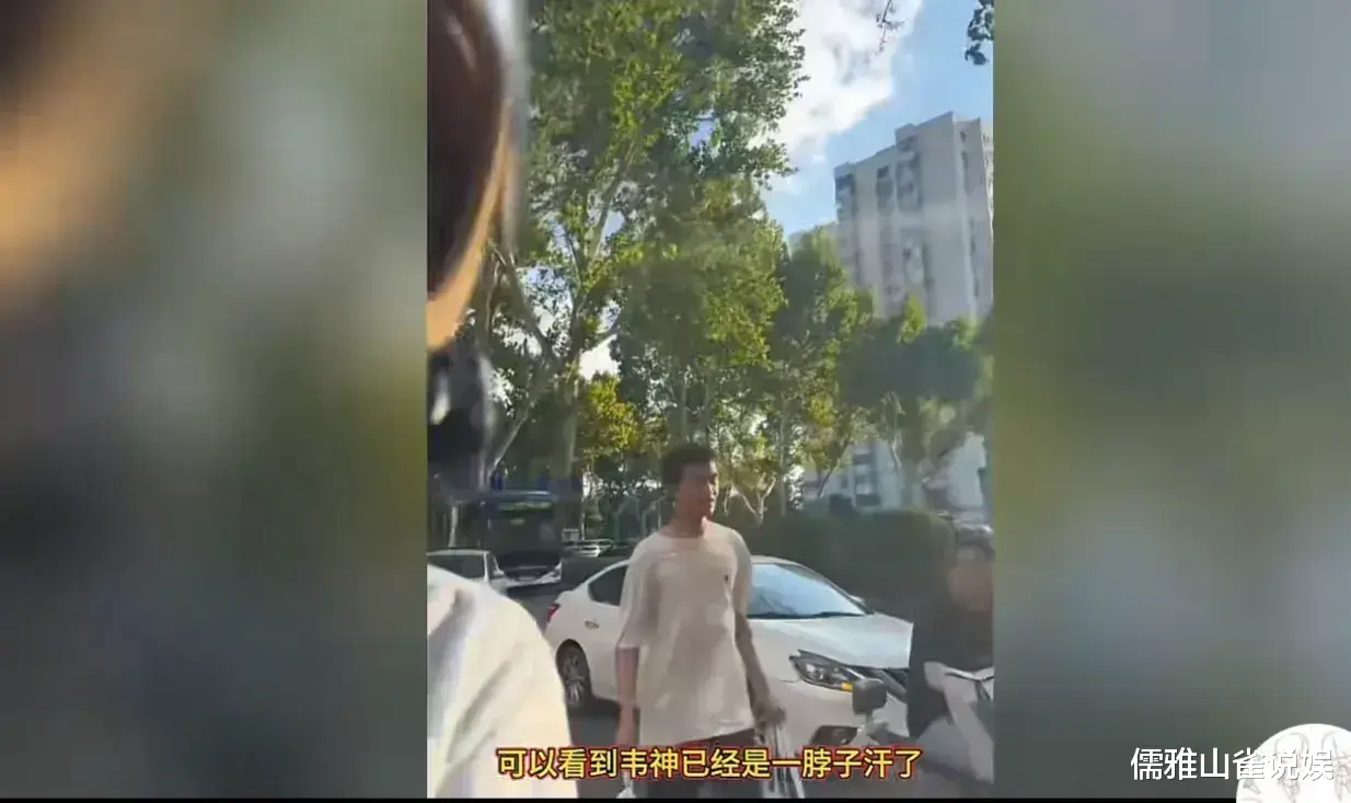 没错,这个汗流浃背的男子,正是数学界的传奇人物韦东奕。他的白色T恤已经被汗水浸湿,紧贴在身上。但他似乎毫不在意,依然保持着平静的表情,一步一步向会场走去。