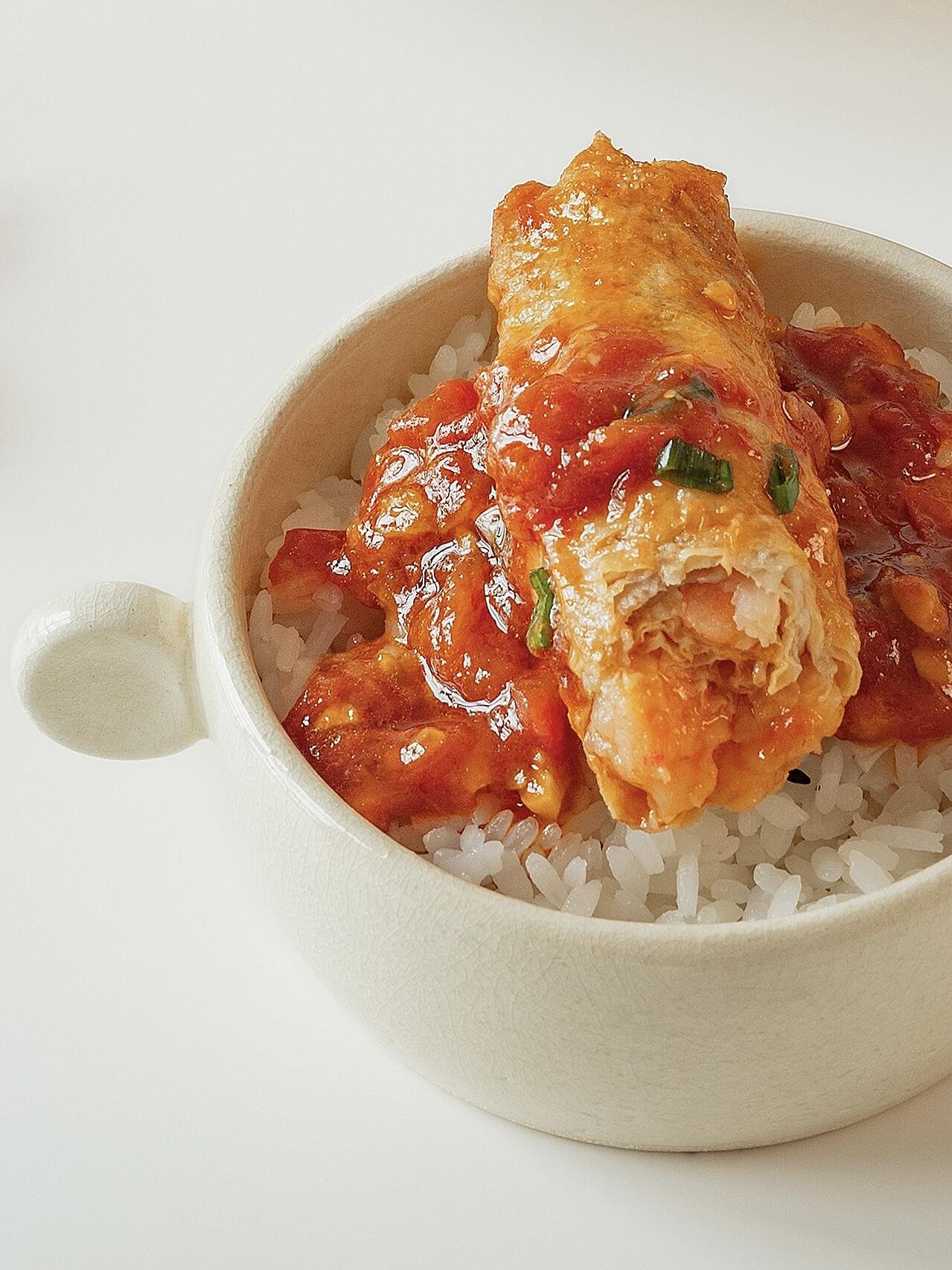 焖煮的时候别闲着,我会把剩下的虾滑分成小份,用手搓成小球,在最后3分钟放进锅里,让虾滑吸满茄汁~ 时间到后开盖,大火收汁1分钟,看到酱汁变得浓稠,紧紧裹在响铃卷上就可以关火啦!