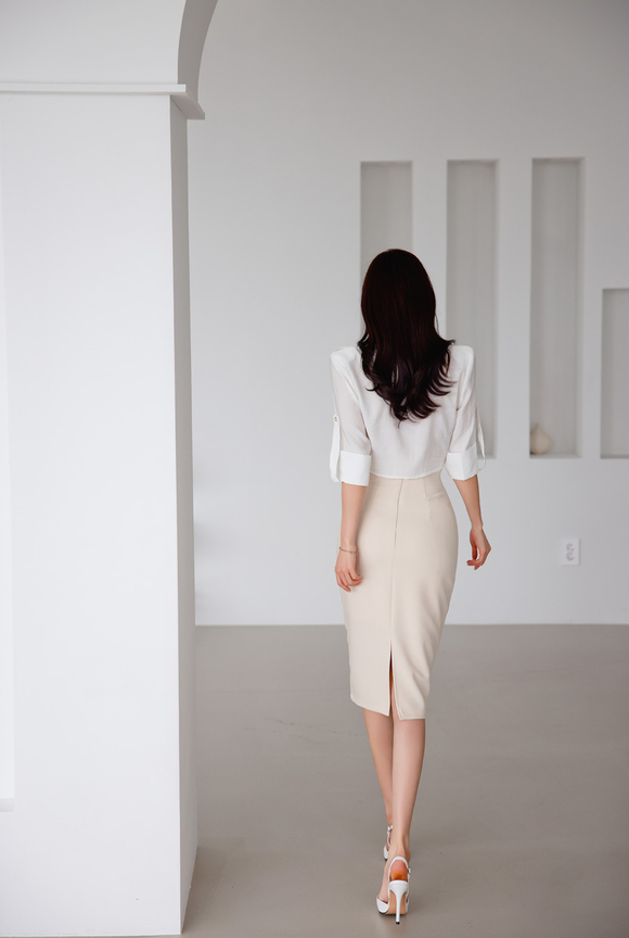 这位女士选择了一件经典的白色衬衫搭配米色铅笔裙,这种组合在职场中永远不会过时。白色衬衫象征着纯洁与专业,而米色铅笔裙则增添了一丝柔和与女性化。这种颜色搭配不仅显得清新脱俗,还能在视觉上给人一种舒适和专业的感觉。