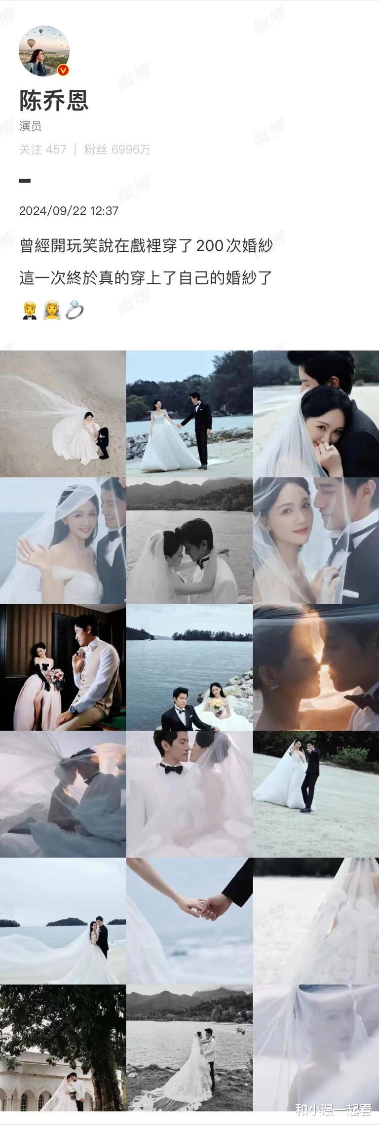 陈乔恩在社交平台晒出18张精美婚纱照,并感性发文:"曾经开玩笑说在戏里穿了200次婚纱,这一次终于真的穿上了自己的婚纱了。"字里行间流露出对爱情的憧憬和期许。