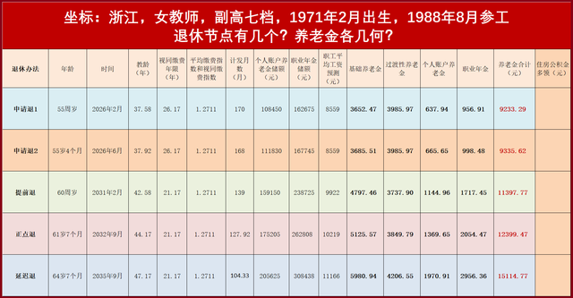 这位1971年2月出生副高七级女教师“5种退法”养老金情况如下: