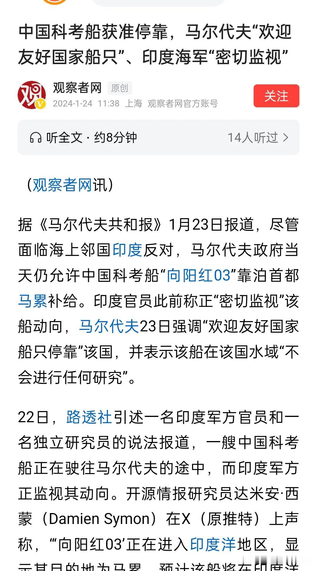 中国一科考船靠岸马尔代夫,印度强烈反对,并派出军舰密切监督,印度这个国家要是强大