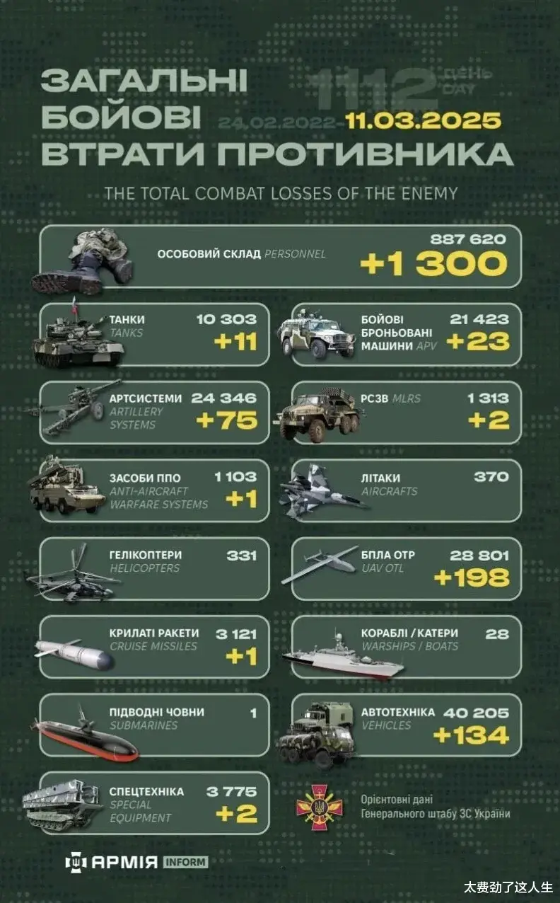 昨天一天俄军单日伤亡1300人,总伤亡人数即将突破89万。