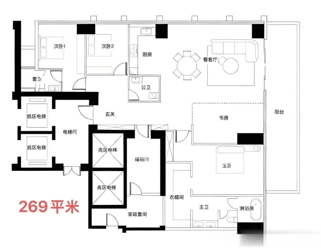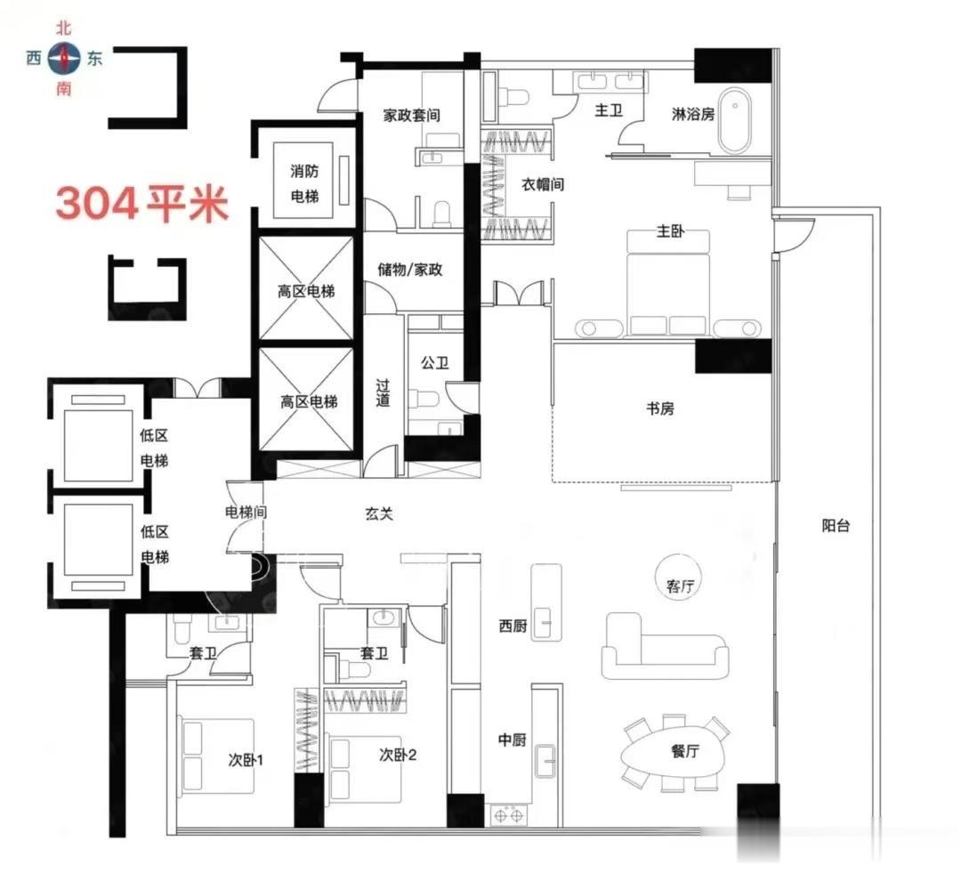澐玺的户型已经出来,分高低区,低区一层四户,其中209平位于西北角,从分布图上看的很清楚,客厅朝北,阳台朝东,房间朝西,低区基本没啥景观。