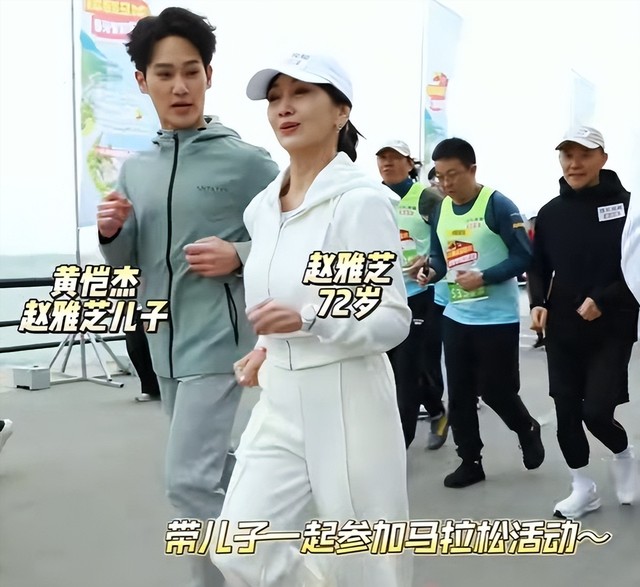 马拉松活动当天,赵雅芝身穿一身白色运动套装和儿子黄恺杰一同亮相。