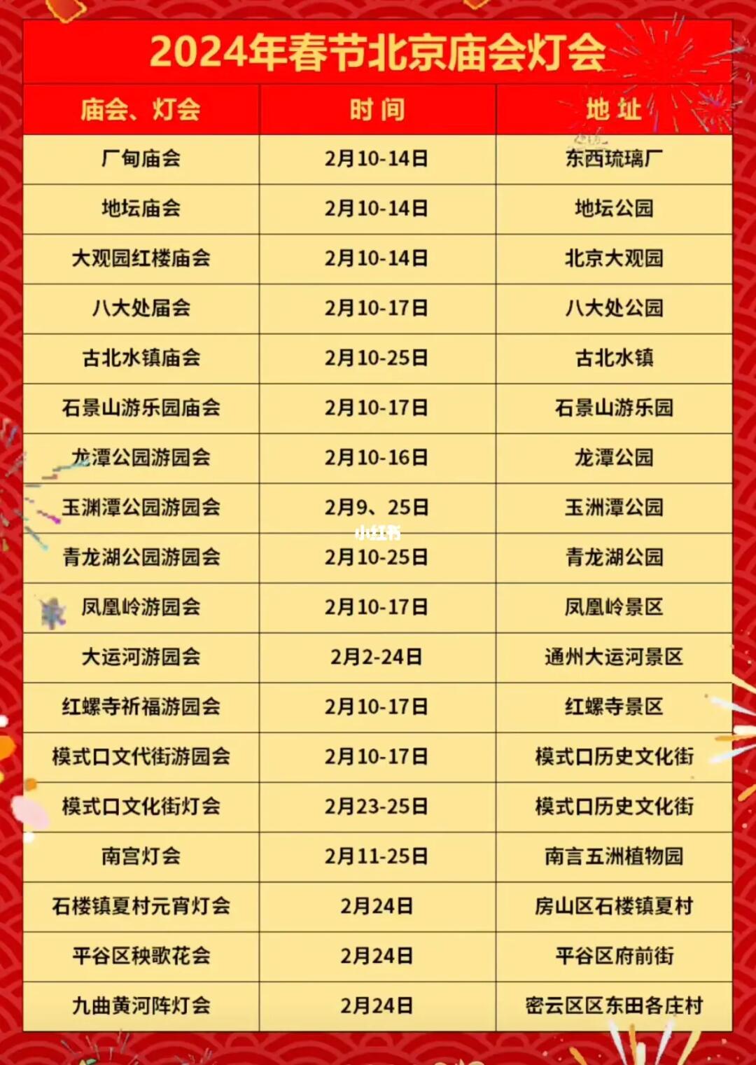 hello大家好 我是芽儿🌱 新春快乐🎆 北京的年味今年加🈵️ 各种庙会都在这啦 图4️⃣可以🌟 🌟庙会分享: 1️⃣厂甸庙会 “逛厂甸”是老北京人独特的春节记忆 🔔时间:2024年2月10日至14日 ❣️地址:西城区和平门外琉璃厂东西街 2️⃣地坛庙会 🔔时间:2024年2月11日至16日 ❣️地址:东城区安定门外大街地坛公园 3️⃣大观园庙会 🔔时间:2024年2月10日至14日 ❣️地址:西城区南菜园街12号北京大观园 4️⃣八大处庙会 🔔时间:2024年2月10日至17日 ❣️地址:石景山区北京八大处公园 5️⃣古北水镇长城庙会 🔔时间:2024年2月9日至17日 ❣️地址:古北水镇日月岛广场 6️⃣龙潭公园庙会 🔔时间:2024年2月10日至16日 ❣️地址:东城区龙潭路8号龙潭公园 ❤️灯会分享: 7️⃣温榆河千灯会 🔔时间:2024年2月2日至7月30日 ❣️地址:朝阳区北京温榆河公园 8️⃣北京国际鲜花港 🔔时间:2024年2月2日至25日 ❣️地址:顺义区杨镇鲜花港南路9号 9️⃣北京宋庄新春彩灯大世界 🔔时间:2024年2月2日至25日 ❣️地址:通州工业区佰富苑1号中国宋庄艺术市集西门 1️⃣0️⃣北京平谷花灯庙会不夜城 🔔时间:2024年2月10日至24日 ❣️地址:平谷区兴谷街道平端街苹东市集 1️⃣1️⃣北京世园公园灯光节 🔔时间:2023年12月21日至2024年3月15日 ❣️地址:延庆区延庆镇百康路1号 1️⃣2️⃣模式口文化街灯会 🔔时间:2024年2月23日至25日 ❣️地址:石景山区模式口历史文化街 🔴发奶茶了,领到了春节慢乐奶茶,真的太幸运了,㊗️大家新年快乐🍾️ 龙年龘龘