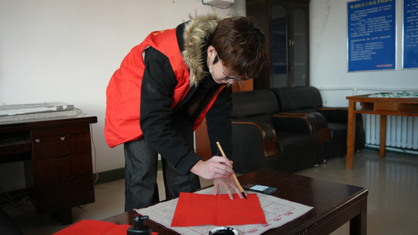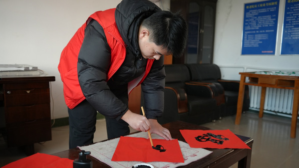 活动现场,志愿者们精心准备了歌曲、舞蹈、诗朗诵等文艺节目。悠扬的歌声在院区回荡,欢快的舞步点燃热情,赢得老人们阵阵掌声与由衷赞许,敬老院内处处洋溢着温馨与欢笑。其间,擅长书法的志愿者铺展红纸、挥毫泼墨,将“福如东海长流水,寿比南山不老松”“春满乾坤福满门,天增岁月人增寿”等一副副寓意吉祥的春联巧绘成篇,笔墨之间饱含真挚祝福。老人们驻足欣赏,频频称赞志愿者的书法技艺,纷纷挑选心仪的春联留作纪念。红纸铺展、墨香四溢,裁纸声、欢笑声交织相融,整个院区洋溢着浓浓暖意。