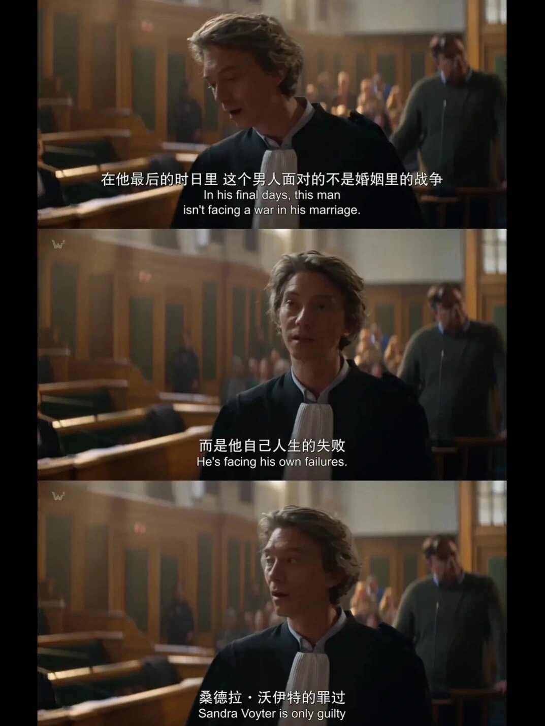 因为丈夫塞缪尔的坠楼死亡,桑德拉成了最大嫌疑人,自杀还是谋杀?控辩双方角逐了两个多小时,而牵涉最深的儿子丹尼尔,却因视力障碍而无法提供有利的证词。