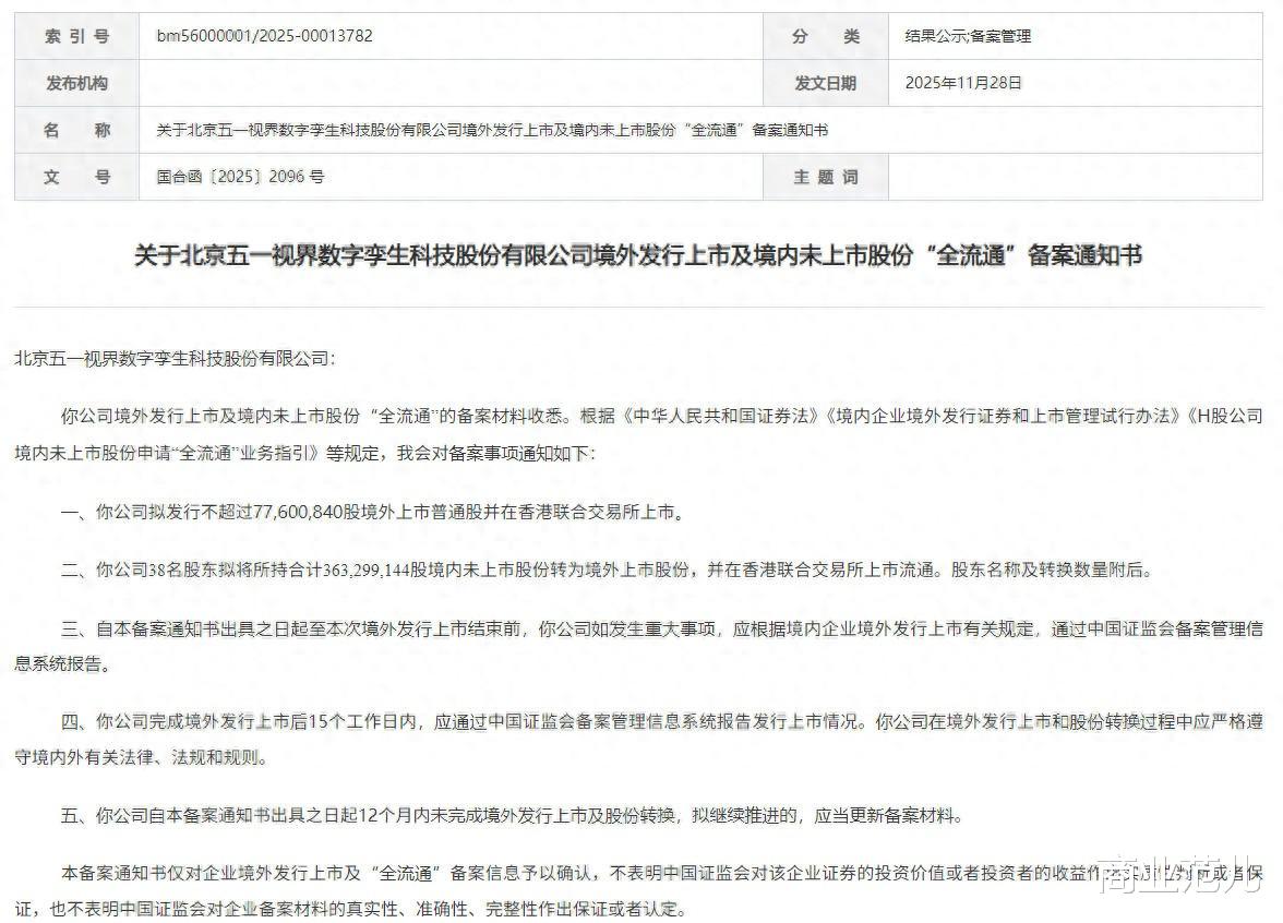 11月28日,中国证监会网站发布《关于北京五一视界数字孪生科技股份有限公司境外发行上市备案通知书》。根据通知书,公司拟发行不超过77,600,840股境外上市普通股并在香港联合交易所上市。公司38名股东拟将所持合计363,299,144股境内未上市股份转为境外上市股份,并在香港联合交易所上市流通。这意味着该公司已获得进入港交所聆讯阶段的前置条件。