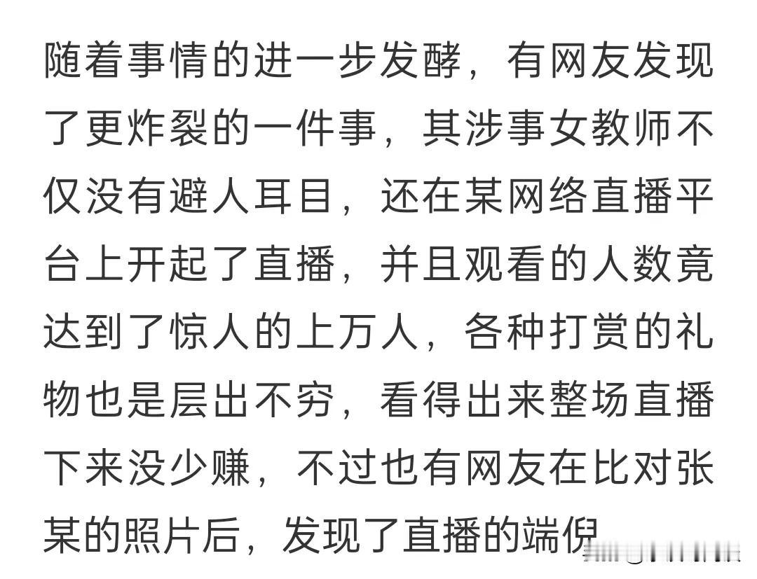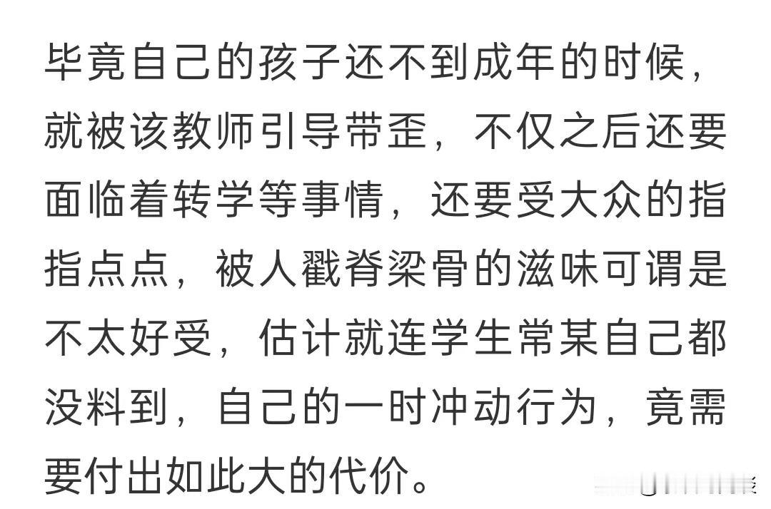 脉冲星 20 2024-02-23 08:51 家长有什么不满的,得了便宜还卖乖,这么漂亮的女老师,你儿子哪里亏了?不知好歹 等待书写的人生 回复 02-23 23:40 人家是高级家庭,父母都是要面子的。不是你想的那样。像他们这种家庭女的随便选,但是现在全国出名了,不仅脸上无光对他们的事业也是影响很大的。 用户44xxx27 回复 02-23 23:27 一段不健康的恋情是什么好事情 老师当了一个猎人