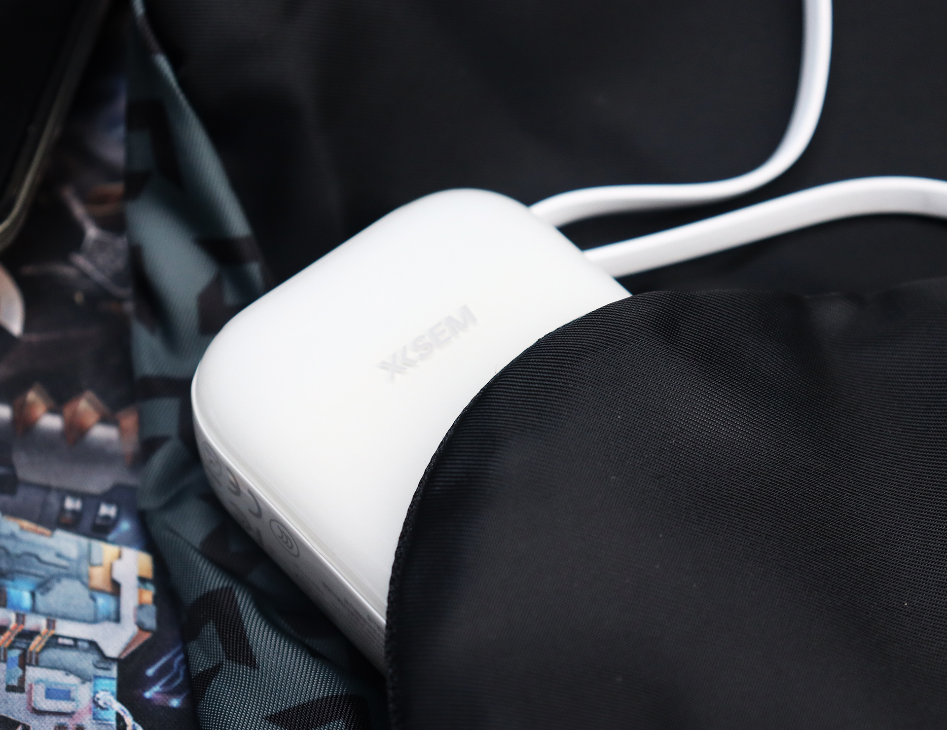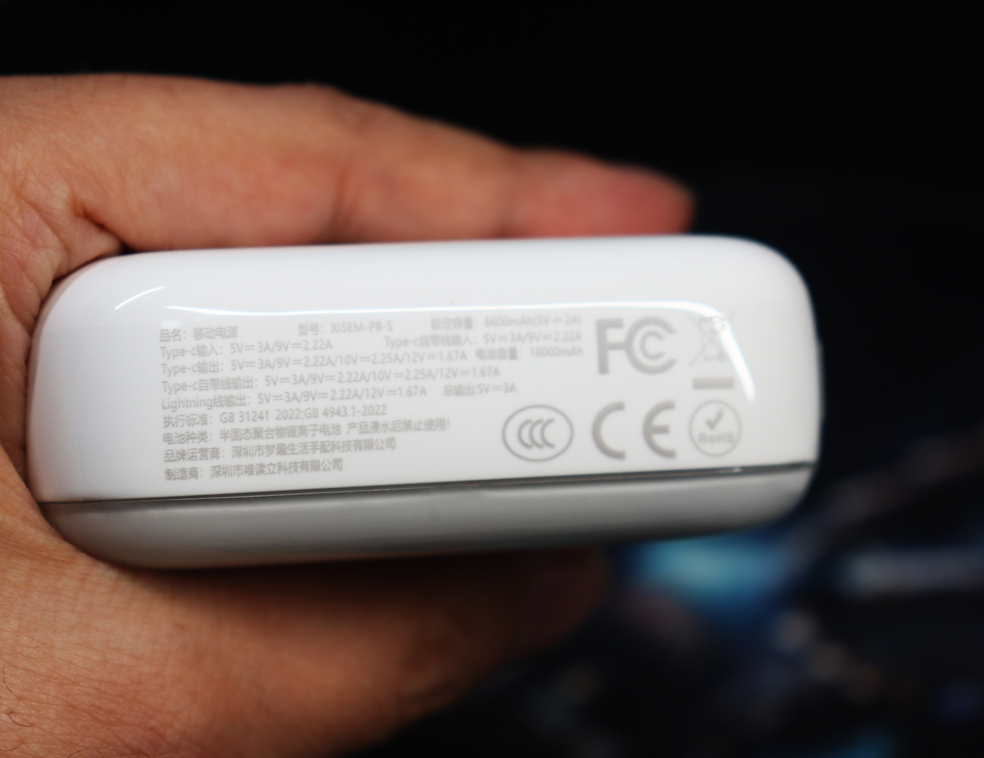 重量方面更是惊喜,整机仅 182g左右,比绝大多数旗舰智能手机还要轻。我之前用的同容量充电宝,普遍都在 230g 以上,出差背在随身包里,一天下来肩膀总坠得慌,而西圣 PB-S 塞在迷你斜挎包里,几乎感受不到它的重量,哪怕是女生出门背的小废包,也能轻松容纳。更重要的是,它 10000mAh 的容量完全符合民航局随身充电宝规定,不用申报、不用托运,过安检随手掏出来就能过检,对于常年飞的出差党来说,这点真的太加分了。同时它还通过了国家 3C 强制认证,纯白色简约机身百搭耐看,从颜值到合规性都挑不出毛病。