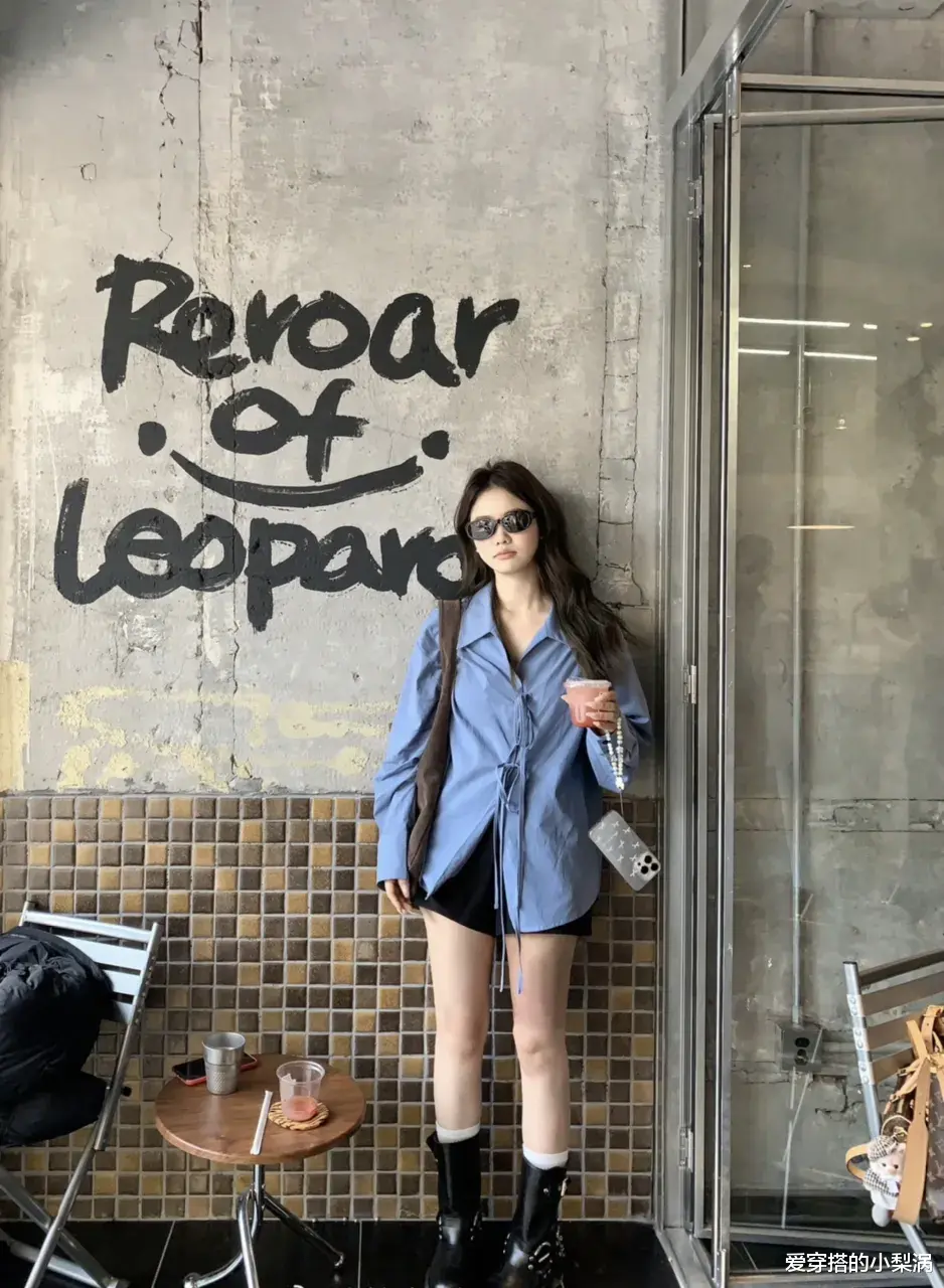 领口系带的蓝衬衫,在视觉上竟多了一丝甜美感。搭配深灰色短裤,将衬衫扎进裤子里,能优化小个子的身材比例,显高效果非常明显。脚上搭配一双小皮鞋,精致感迅速得以提升。